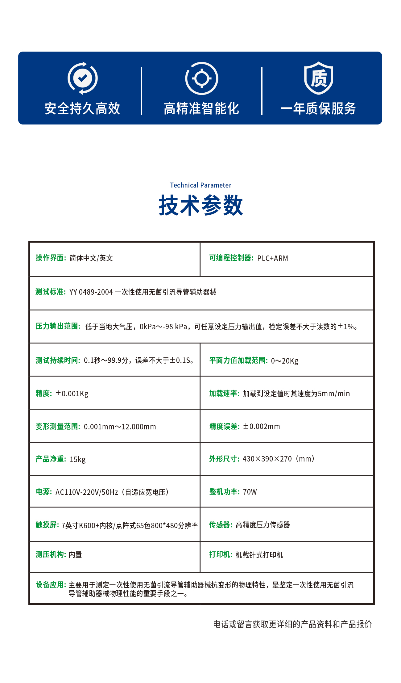 威夏科技XB0489-C引流系统组件抗变形测试仪主要用于测定一次性使用无菌引流导管辅助器械抗变形的物理特性,是鉴定一次性使用无菌引流导管辅助器械物理性能的重要手段之一。采用可编程控制器,触摸屏,压力传感器,加压装置,机载打印机等组成。产品规格、测试压力值设定、保持时间设定,打印设定、测试、加压、减压、时间、标定,检定等。机载打印测试数据。实时显示测试加压值,保持时间等数据。