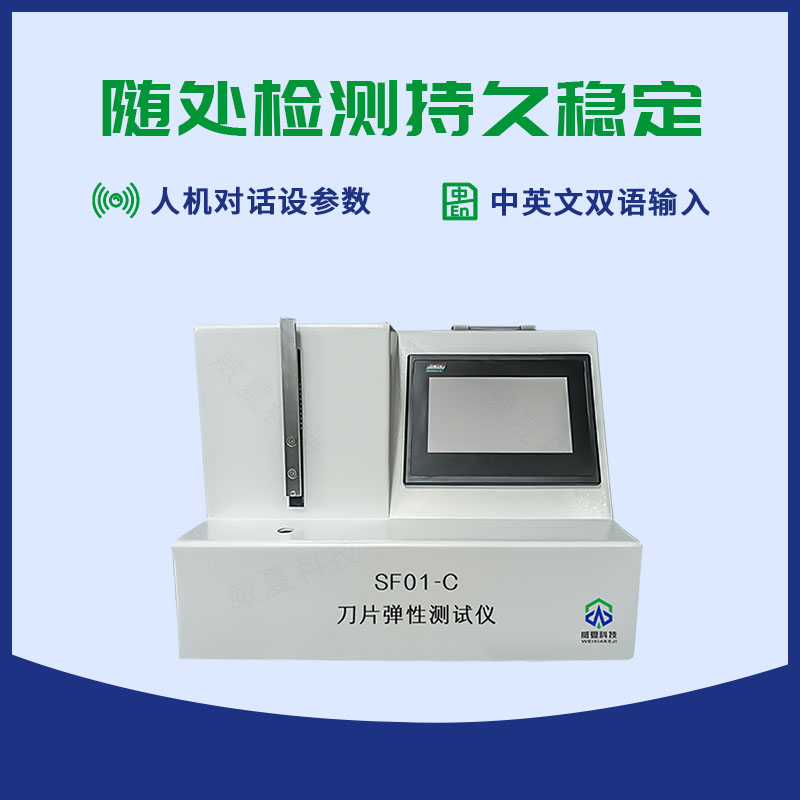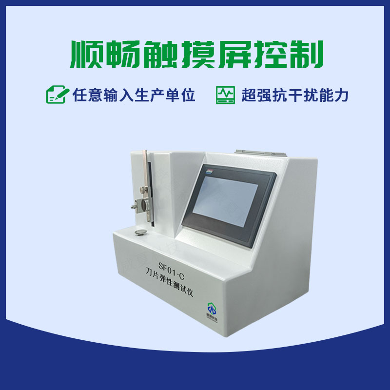 威夏科技SF01-C刀片弹性测试仪是国家检验生产厂家产品性能的高效检测设备。刀片弹性测试仪主要用于测定医用刀片弹性的物理特性,是鉴定医用手术刀片的重要手段之一。由可编程控制器、液晶显示屏、步进电机控制的传动机构、百分表显示的实测距离打印机等组成,可设定规格,下行距离。在屏上显示下行距离,试验时间,变形量,并可由打印机打印出试验数据。