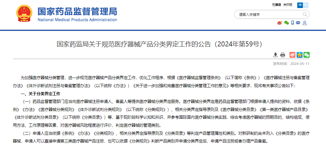 为加强医疗器械分类管理,进一步规范医疗器械产品分类界定工作,优化工作程序,根据《医疗器械监督管理条例》(以下简称《条例》)《医疗器械注册与备案管理办法》《体外诊断试剂注册与备案管理办法》(以下统称《办法》)《关于进一步加强和完善医疗器械分类管理工作的意见》等相关要求,现将有关事项公告如下:
