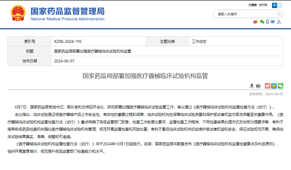 6月7日,国家药监局党组书记、局长李利主持召开会议,研究部署加强医疗器械临床试验监管工作,审议通过《医疗器械临床试验机构监督检查办法(试行)》。