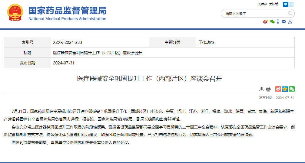 7月31日,国家药监局在宁夏银川市召开医疗器械安全巩固提升工作(西部片区)座谈会。